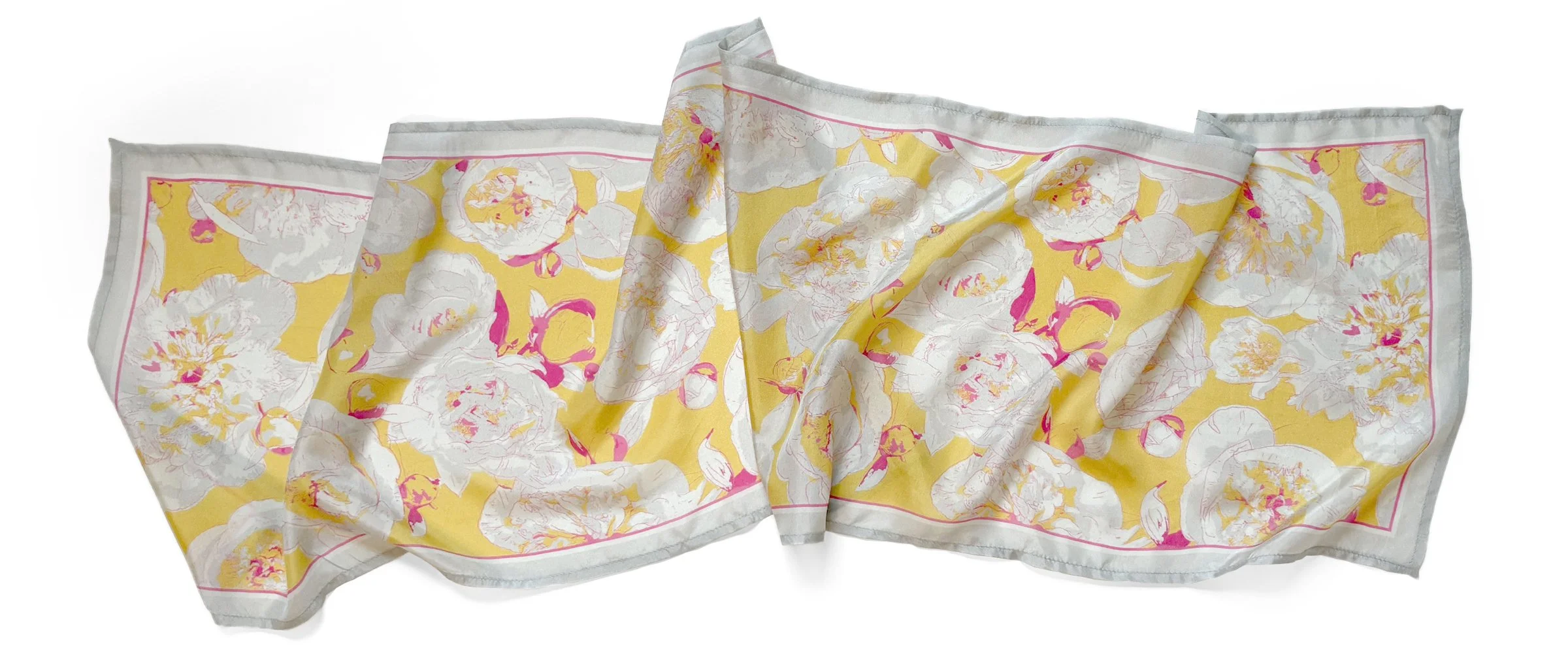 Marylouise scarves make a beautiful addition to any wardrobe! Offered in four sizes, our scarves are handmade from soft, lightweight 100% habotai silk printed with original floral designs. These beauties may be hand-washed in cold water and hung to dry or machine dried on low. Available on Faire or contact us to request a price sheet. Get to know more about our variety of sizes below.
